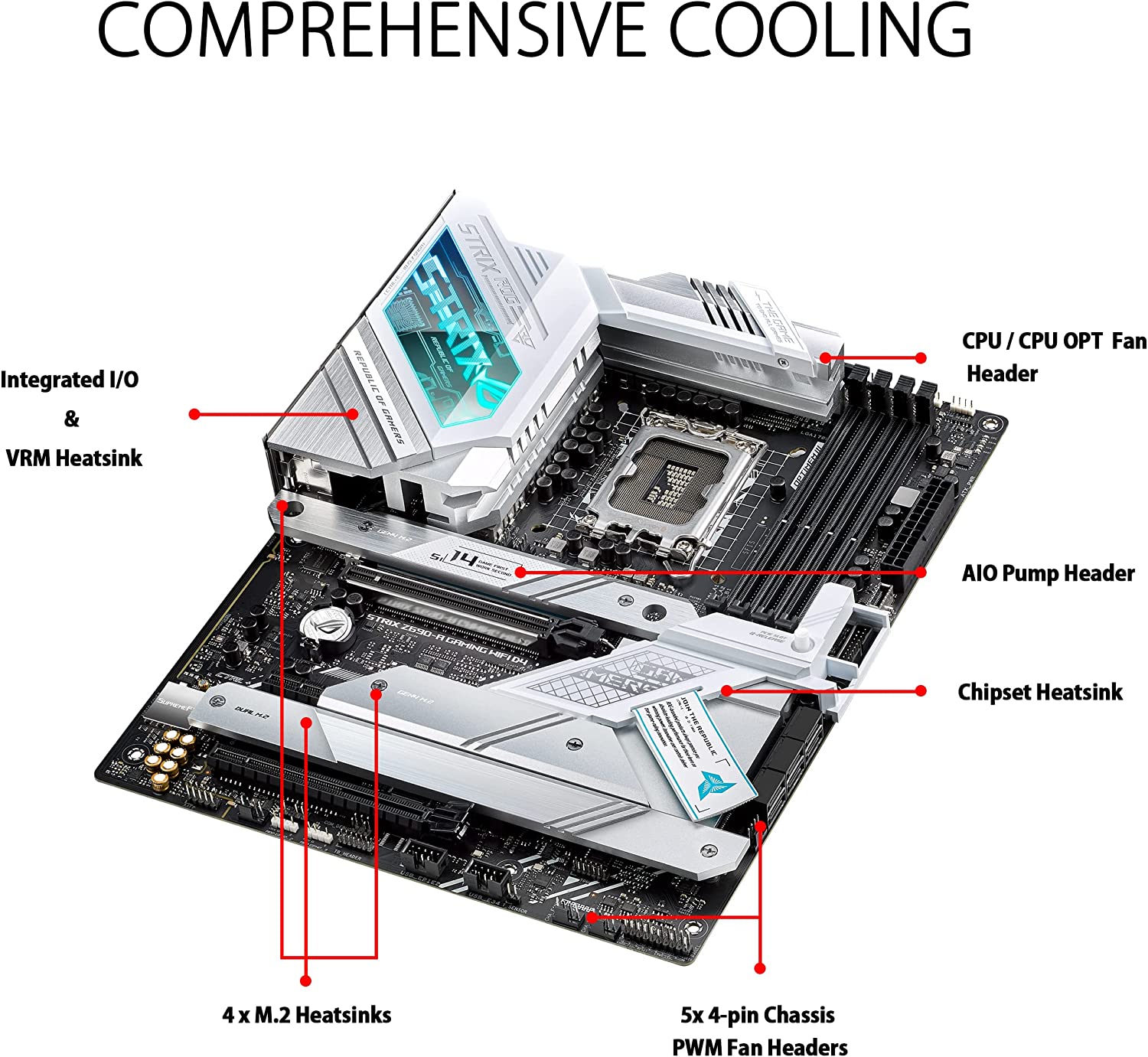 The ASUS ROG Strix Z690-A Gaming WiFi D4 white and silver scheme motherboard is designed with boosted power delivery and optimized cooling to cope with the demands of powerful 12th Generation Intel Core processors. Along with Wi-Fi 6 and PCI Express 5.0 for superfast transfer speeds and storage, ROG Strix Z690-A Gaming WiFi D4 is ready to take the helm of your clean and neat white gaming gear.