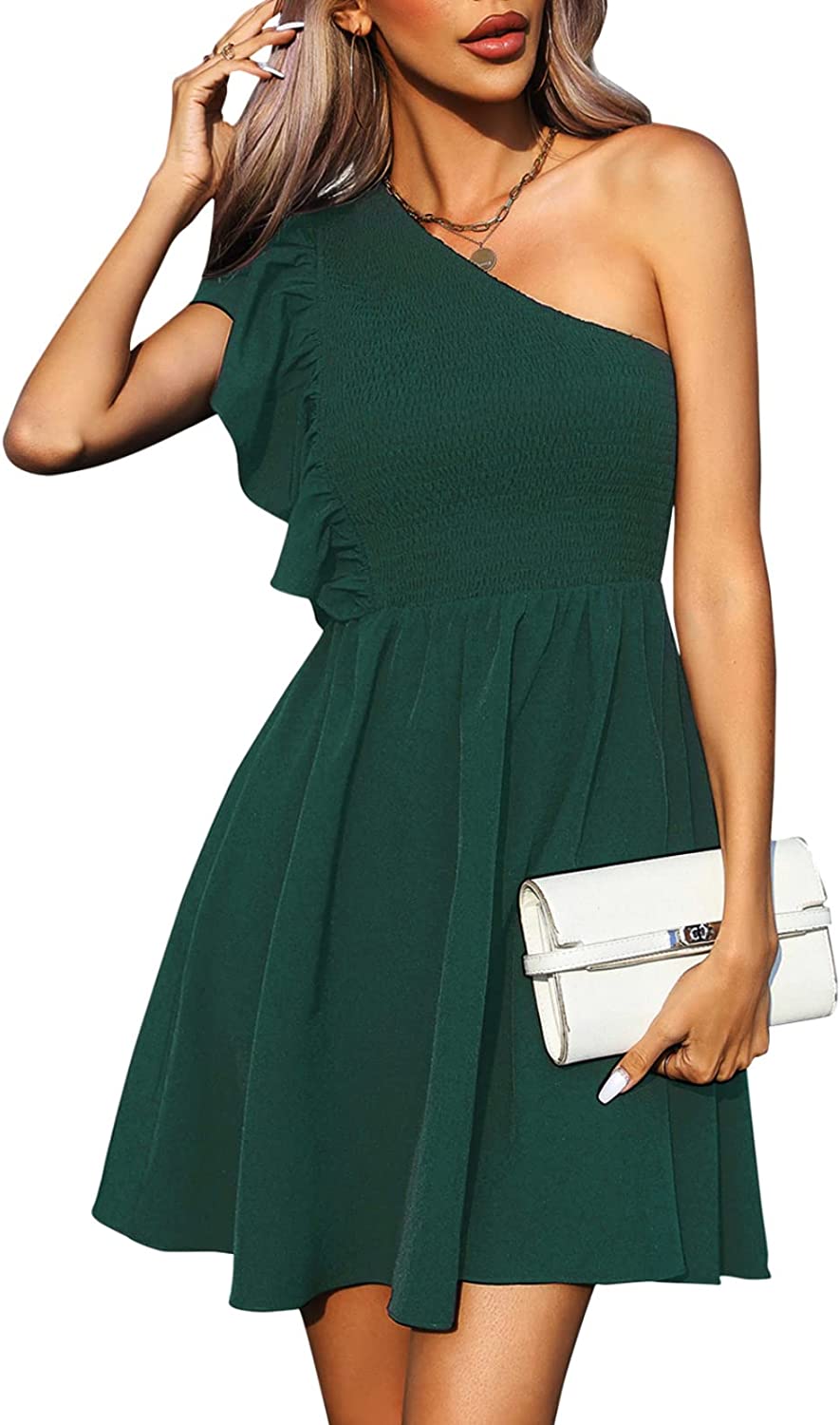 Byinns Women's 2023 Summer One Shoulder Cocktail Dress Ruffle Sleeveless Smocked Dress Party Wedding Guest Mini Dresses