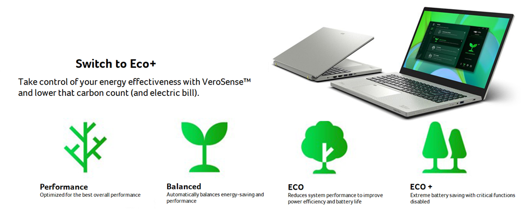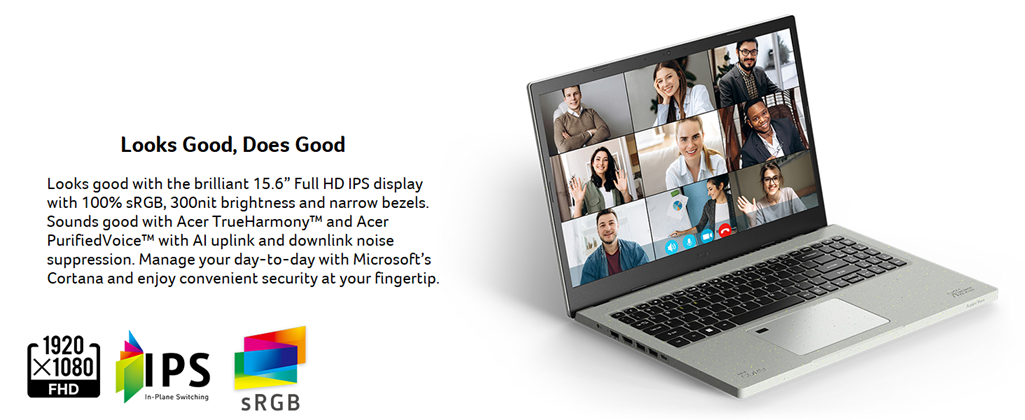 Acer Aspire Vero AV15-51-7617 comes with these high level specs: 11th Generation Intel Core i7-1195G7 Processor 2.9GHz with Turbo Boost Technology up to 5.0GHz (12MB Smart Cache), 15.6" Full HD (1920 x 1080) Widescreen LED-backlit IPS Display (100% sRGB and 300nit Brightness), Intel Iris Xe Graphics, 16GB DDR4 Memory, 512GB NVMe SSD, True Harmony Technology, Two Built-in Stereo Speakers, Acer Purified.Voice Technology with AI Noise Reduction & Two Built-in Microphones, 802.11ax Wi-Fi 6 Dual-Band 2.4GHz and 5GHz featuring 2x2 MU-MIMO technology, 10/100/1000 Gigabit Ethernet LAN (RJ-45 port), Bluetooth 5.0, Acer Bio-Protection Fingerprint Solution, featuring Computer Protection and Windows Hello Certification, Back-lit Keyboard, HD Webcam (1280 x 720), 1 - USB 3.2 (Type-C) Gen 1 port (up to 5 Gbps), 2 - USB 3.2 Gen 1 Ports (one with Power-off Charging), 1 - USB 2.0 Port, 1 - HDMI 2.0Port with HDCP support, Lithium-Ion Battery, Up to 7.0-hours Battery Life, Amazon Alexa, Acer Vero Protective Sleeve, Windows 11 Home, EPEAT Silver Certified, 3.97 lbs. | 1.8 kg (system unit only) (NX.AYCAA.006).