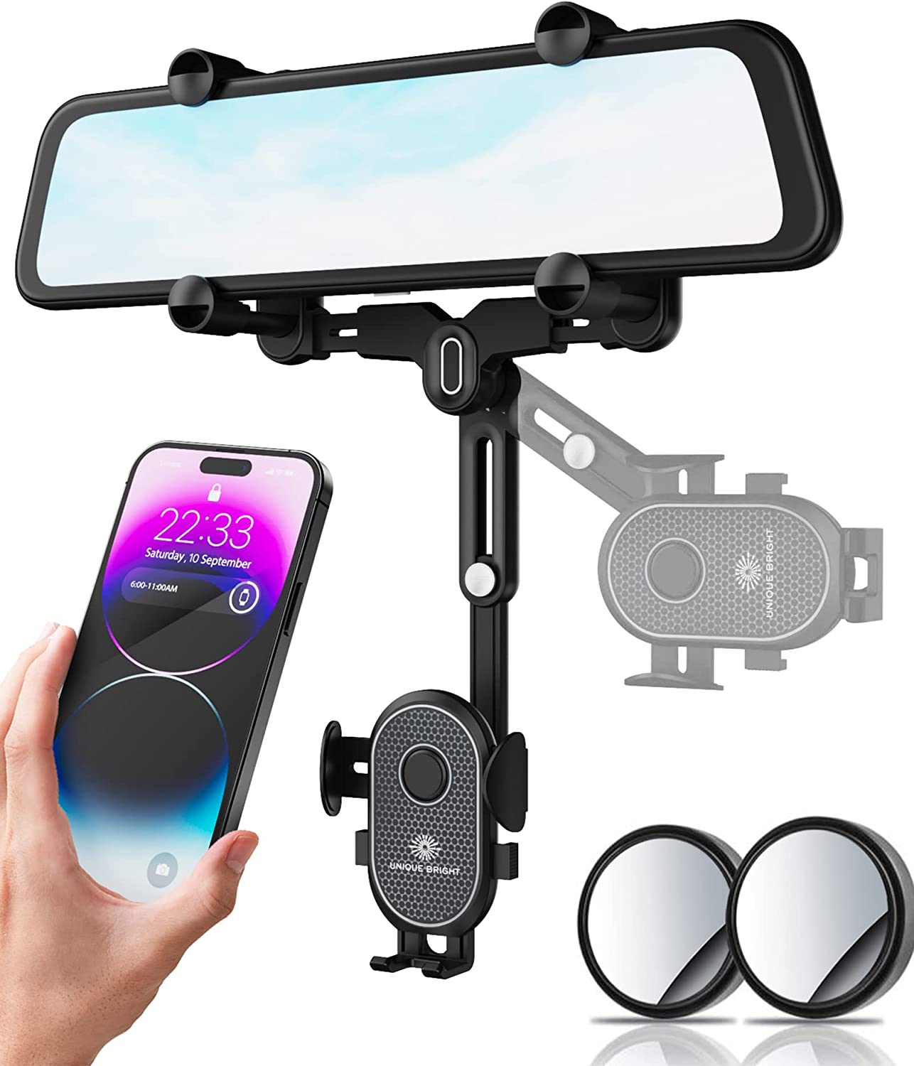 【Rotatable & Retractable Design】The rear view mirror phone mount features telescopic & rotary design. The telescopic arm which extends from 5.1-7.3 inches, allowing for more maneuverability than traditional fixed mounts. Once attached,To adjust the telescoping arm to fine-tune your viewing angle.