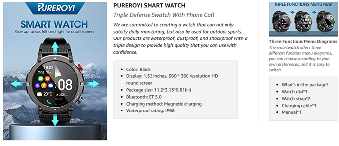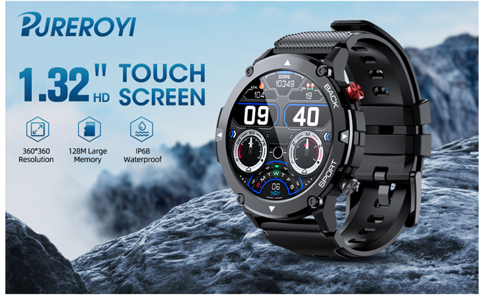 PUREROYI Smart Watch for Men Bluetooth Call (Answer/Make Call) IP68 Waterproof 1.32'' Military Tactical Fitness Watch Tracker for Android iOS Outdoor Sports Smartwatch(Black)