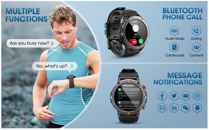 • ⌚【BLUETOOTH DIALING & BUILT IN SPEAKER】- With Bluetooth 5.0, you can directly dial the phone number and answer calls on your watch. You can get notifications of calls, SMS and SNS messages, Whatsapp, text, Facebook, etc. You will never miss any calls & messages during meetings or workouts.