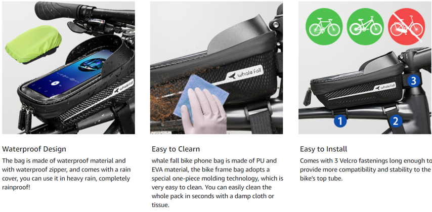 - ?【Easy to Install】Whale fall phone holder for bike is suitable for any bike with a frame. With three magic straps you can adjust the phone holder on the bike frame and top tube of the bike. The bike frame bag firmly fit on your bike! It never disturbs your knees or legs while riding.Tipps: Before you put your phone in the bike bag, please turn off the Aaccidental Touch Protection in the phone settings to prevent the phone from being inoperable after putting it in the bike frame bag.