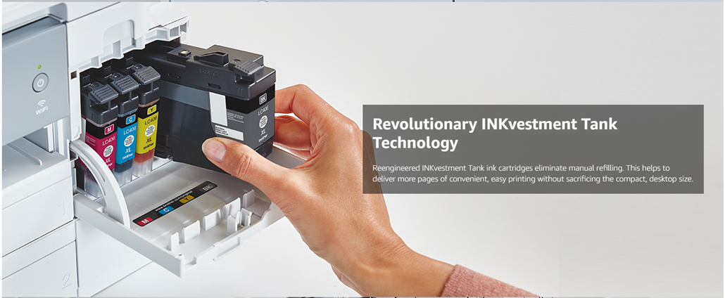 Finish large print jobs efficiently in your office using a Brother MFC-J4535DW INKvestment Tank Wireless Inkjet All-in-One Color Printer. A 400-sheet input tray makes it easy for the office to accomplish their tasks 1 after the other. Print from your phone or a tablet while you’re away from your desk thanks to Wi-Fi Direct technology built into this wireless all-in-one printer. NO INK REPLACEMENT FOR UP TO 1-YEAR(1): Experience truly uninterrupted printing, exceptional savings and super convenience with up to 1-year of ink using only the four cartridges provided in-box.(1) PUT THE POWER OF PRINTING AT YOUR FINGERTIPS: The simple to use free Brother Mobile Connect(2) App delivers easy onscreen menu navigation for printing, copying, scanning, and printer management from your mobile device. THE BROTHER REVOLUTIONARY INKVESTMENT TANK SYSTEM: Brother INKvestment Tank printers feature reengineered ink cartridges that hold more ink and deliver a continuous ink supply to the internal tank for truly convenient, uninterrupted printing. ELIMINATE INK REPLACEMENT GUESSWORK: Print with confidence using the Brother Page Gauge,(3) a visual, numerical way to know the amount of ink used and the amount of ink remaining to help take the guesswork out of when to replace ink. USES BROTHER GENUINE INKVESTMENT TANK INK: Intelligently engineered to work with your INKvestment Tank inkjet printer. Standard Yield: LC406BK, LC406C, LC406M, LC406Y, LC406 3PK, LC406 4PK. High Yield: LC406XLBK, LC406XLC, LC406XLM and LC406XLY. BROTHER AT YOUR SIDE SUPPORT: 2-Year Limited Warranty and At Your Side support for the life of your product - visit us at www.brother.com. REFRESH: Large page yields means less ink replacement. When you do need to replace your ink supply, choose Brother Genuine LC406 Standard or High-Yield INKvestment Tank replacement cartridges for even more convenience. To avoid worrying about running out of ink again, get started with Refresh EZ Print Subscription service and save