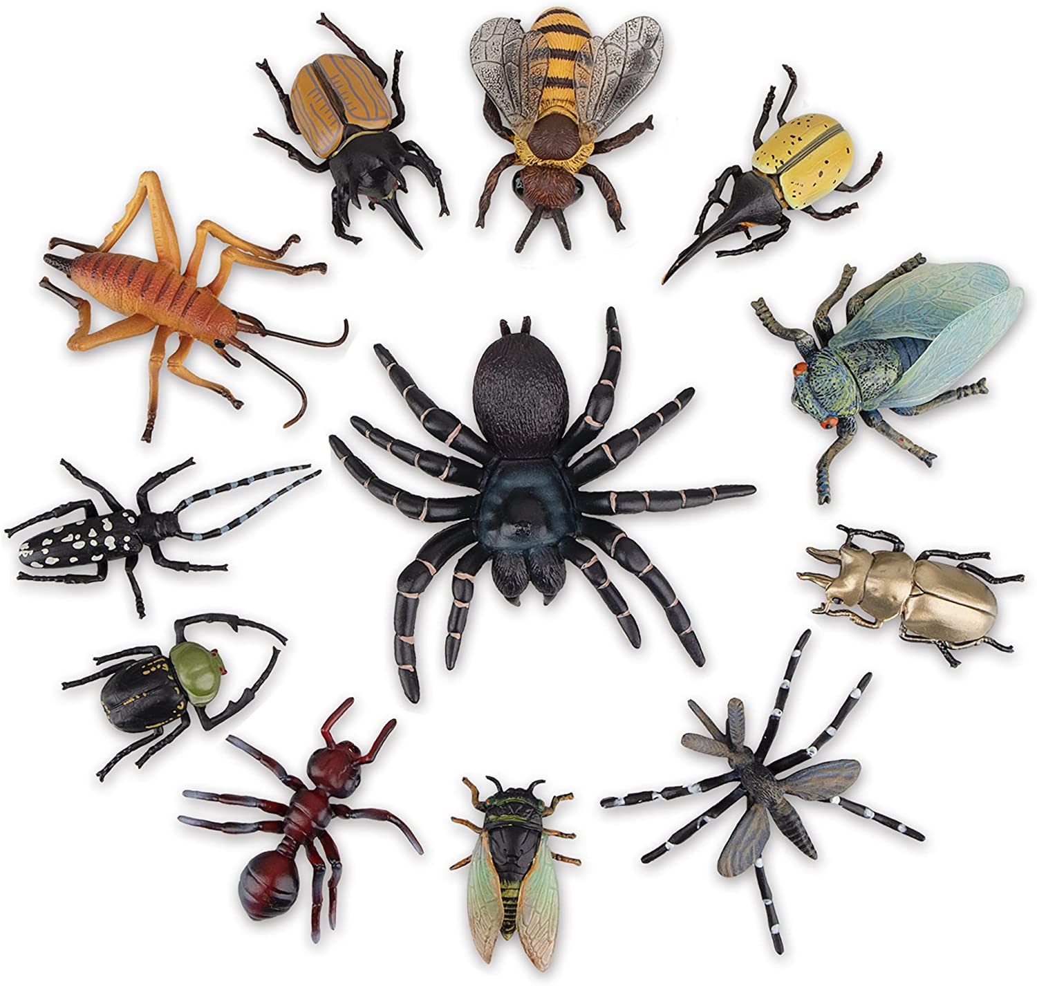 - ✔ 12PCS HIGH QUALITY INSECTS FIGURINES - Includes 1 Dynastes Hercules, 1 Cicada, 1 Macular Longhorns, 1 Scarab Cheirotonus Jansoni Jordan, 1 Spider, 1 Cricket, 1 Aedes Mosquito, 1 Eupatorus Gracilicornis, 1 Housefly, 1 Ant, 1 Bee, 1 Allotopus Rosenbergi. Totally includes 12 bugs figurines.