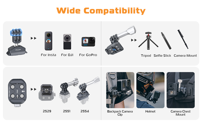 • Wide Compatibility: The Quick Release Kit is compatible with a wide range of action cameras, such as GoPro 10/11 and DJI OSMO Action 2/3 and those with a conventional GoPro interface. Note: Do not over-tighten the knob when no device is installed.