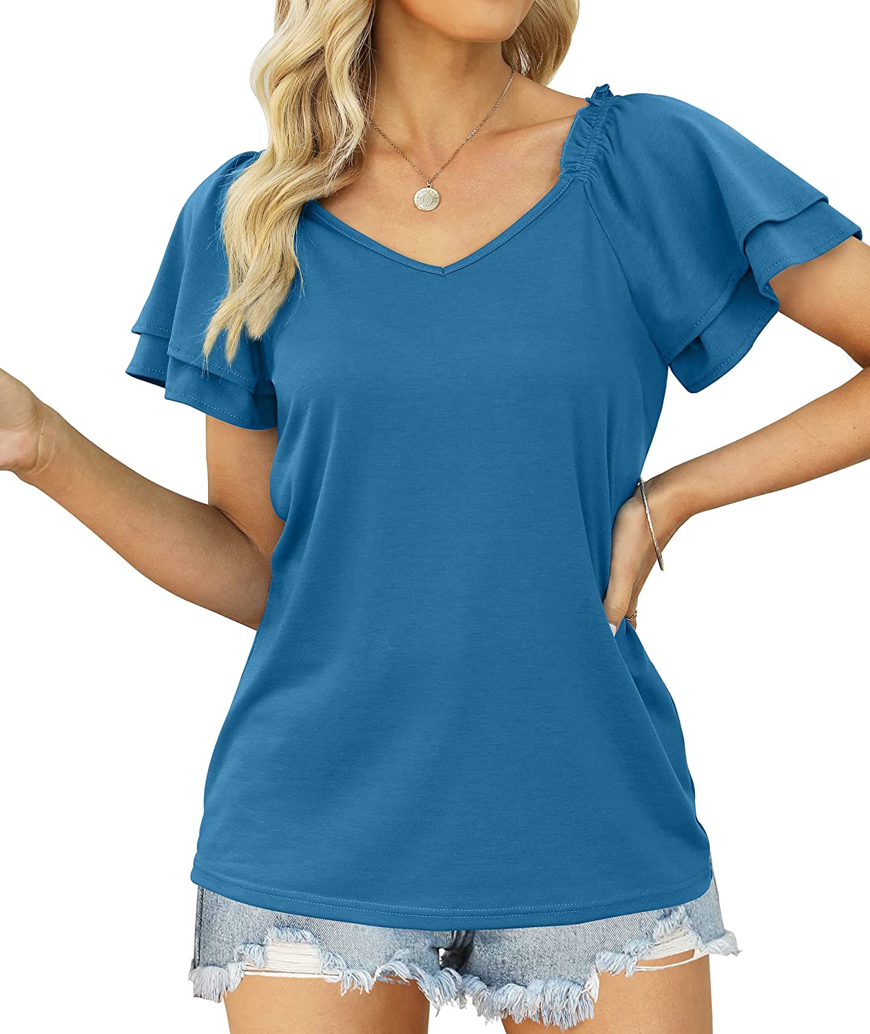 Feature:Cute Summer Tops for Women. Dual Layer Flounces Sleeves, Smocked Shirred, V Neck, Ruffle Sleeve, Loose Fit, Super Stylish!