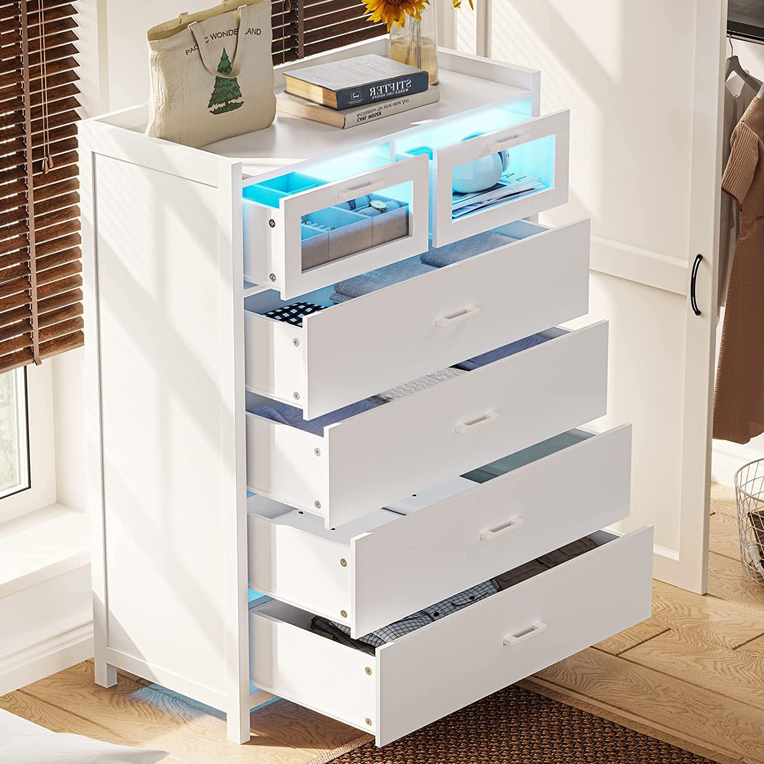 VIAGDO Dresser for Bedroom, Chest of Drawers with LED Lights, White Tall Dresser with 6 Drawers, Wood Large Capacity Storage Cabinet for Nursery, Kids Room, Entryway