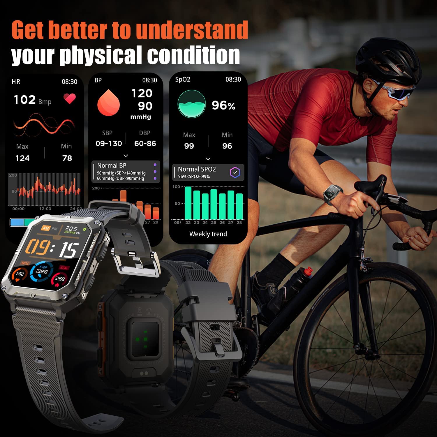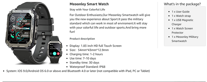 - 【Fitness Smartwatch for Outdoor enthusiasts】This Meoonley Sportwatch designed for outdoor enthusiasts.It pass Military Standard Verification. It can work in most of extreme conditions.And it support IP68 Waterproof standard.You can wear this sport watch while washing hands, walking in the rain or swimming even underwater sports. It can meet all your daily needs even underwater exploration.To enjoy the fun of outdoor exploration.