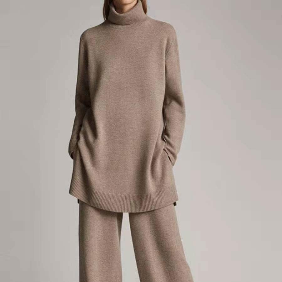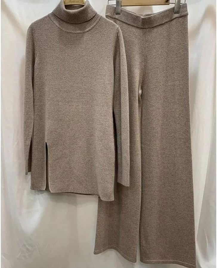 Walnut Autumn and Winter Knitted Solid Color Turtleneck Loose Sweater Wide-Leg Pants Casual Two-Piece Suit (Color : D, Size : L Code)