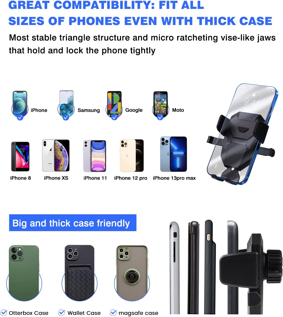 • 【Ungraded Design & Wide Compatibility】Made of high quality ABS material with wider clamps, the phone holder mount works well with different sizes of phones even with thick case. And the reserved charging port makes you charge your phone easily.