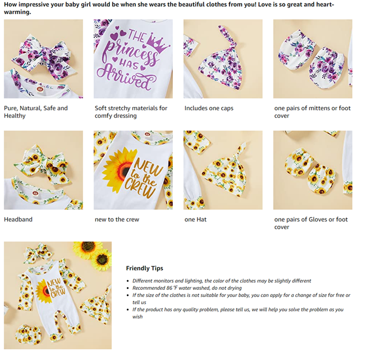 OBTAIN:You will get 1 x Romper + 1 x Headband + 1 x Gloves + 1 x Hat. Pls hand wash cold, line dry, Do not bleach, iron, or tumble dry.