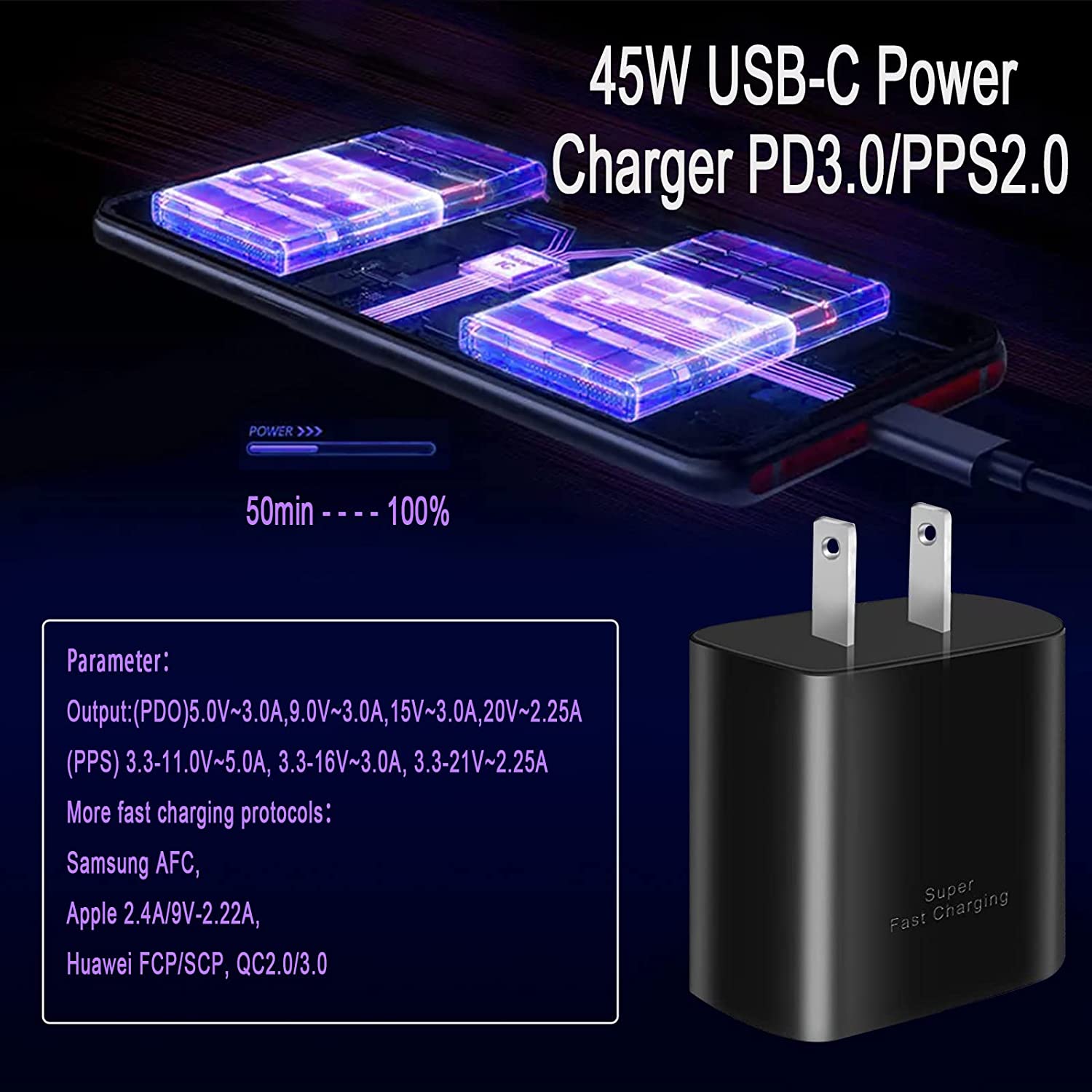 ⚡ More Fast Charging Protocols : This super fast charger samsung 45 watt contains other fast charger protocols which meet your different needs. They are Samsung AFC, Apple 2.4A, Huawei FCP/SCP and QC2.0/3.0. So you can use 45w samsung super fast charger block for samsung devices or other devices.