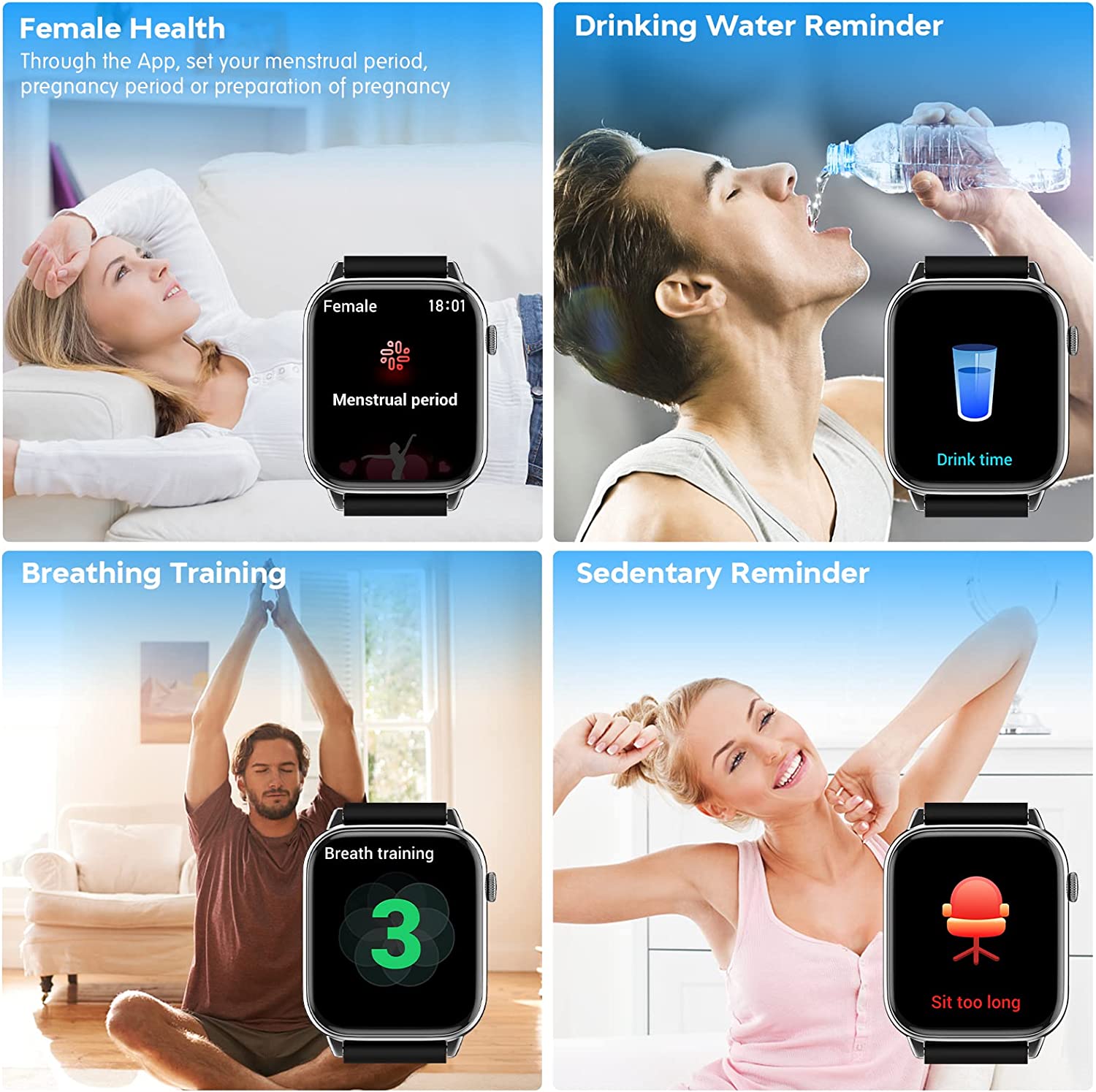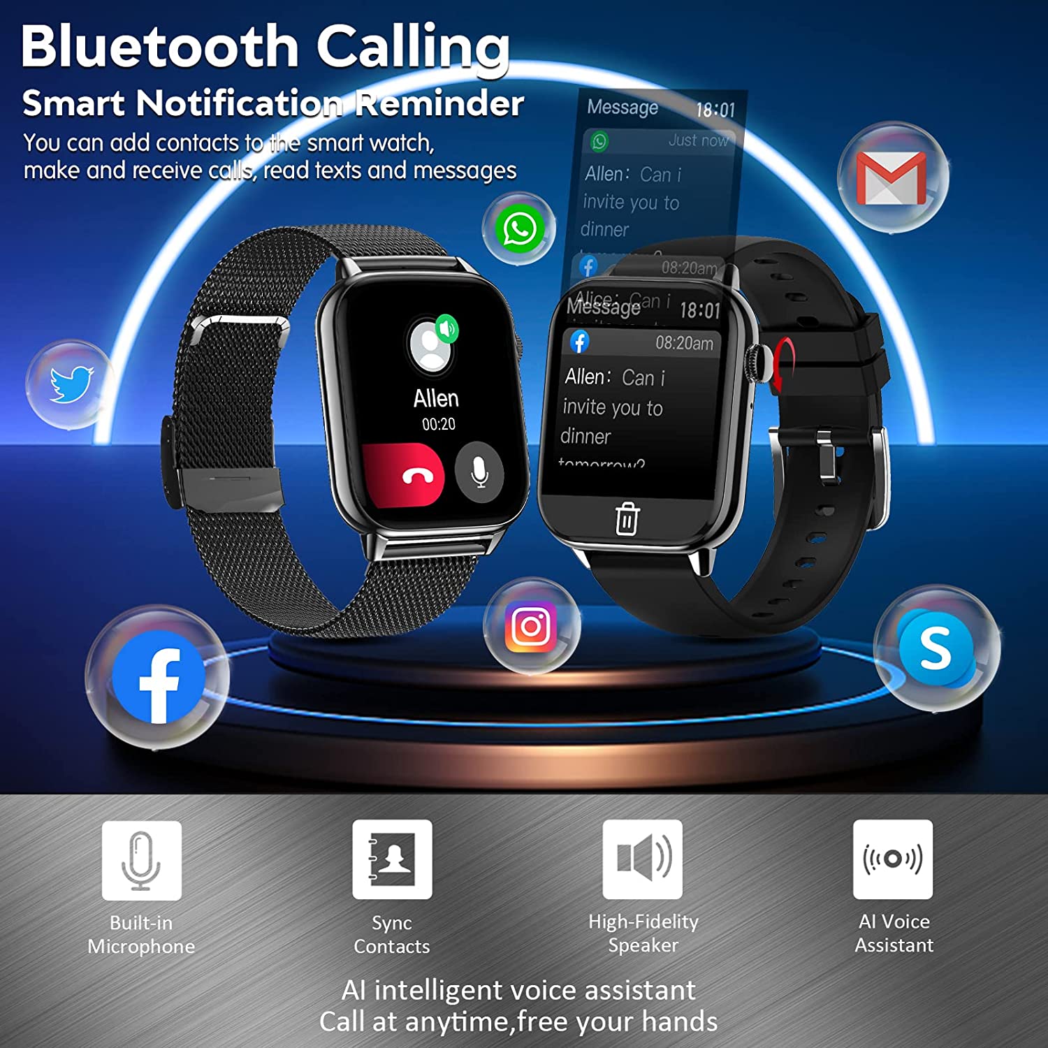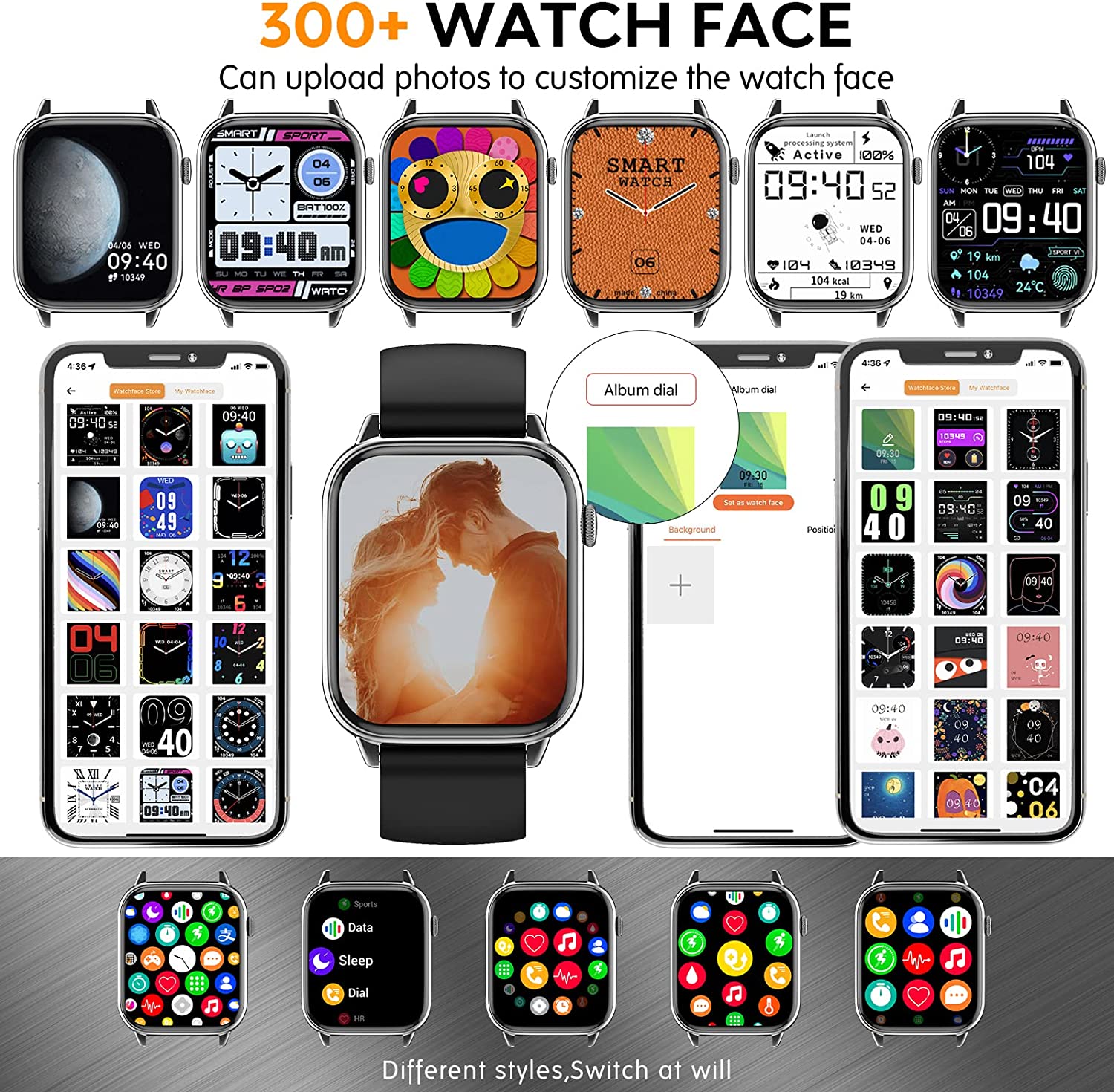 • ?【1.9"(diagonal) HD Large Screen & Customized Watch Faces】Using the 2023 latest technology, this blood pressure watch for android ios phones is equipped with a 1.9"(diagonal) 240*280 ultra-clear full-touch color screen. We have carefully designed beautiful 10 UI menu and 300+ watch faces for you, and you can also upload photos through the APP to customize watch faces(can rotate the crown of the call smart watch to change the watch face or double-click the crown to change the UI menu)