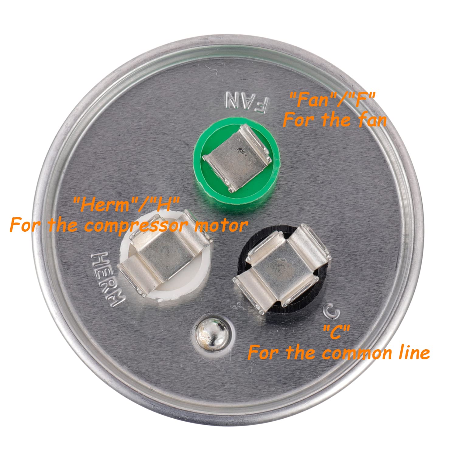 ▲Three terminals on the top are labeled "Herm"/"H" for the compressor motor, "Fan"/"F" for the fan, and "C" for the common line.