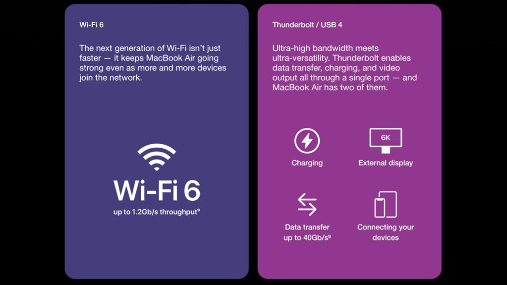 | Charging and Expansion | Two Thunderbolt / USB 4 ports with support for: Charging, DisplayPort, Thunderbolt 3 (up to 40 Gbps), USB 3.1 Gen 2 (up to 10 Gbps) |
