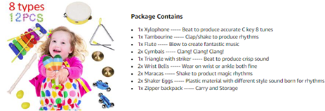 • Complete Musical Instruments for a Small Band - This kids musical instruments set provides drum, maracas, xylophone, Kazoo, Jingle stick, children could circle around and compose Jazz anytime. Specially the Kazoo, it is the most interesting and creative toy and instruments. Note to make sound like hum a tune, which will bring the vibration of the film inside. Search "Tsuko G" on youtube to learn how.
