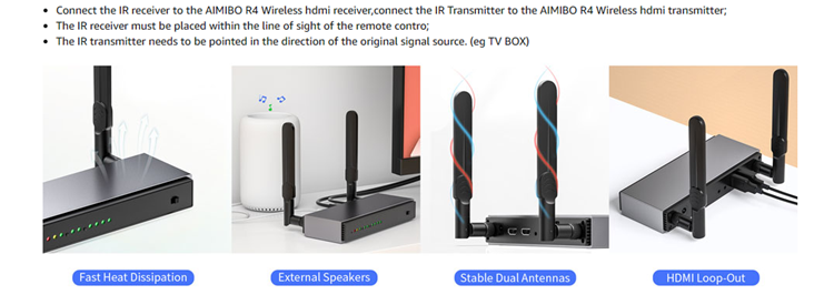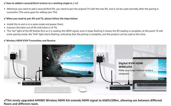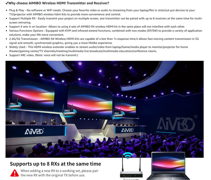- 【Up to 8 Kits use in one location】 - Each pair of AIMIBO Wireless HDMI transmitter and receiver can be set with a independent channel to allow multiple extender kits to be used in the same environment without interference.
