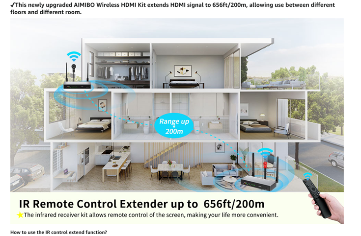 - 【IR Remote Control & KVM】 - This wireless hdmi extender is convinient for easily control the source device on the receiver between different room, different floors with any IR remote control or keyboard/mouse. It is the best choice for home theater, widely used in meeting rooms,Classrooms,Training rooms, living rooms, Roofs, Garages, Etc.