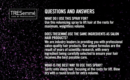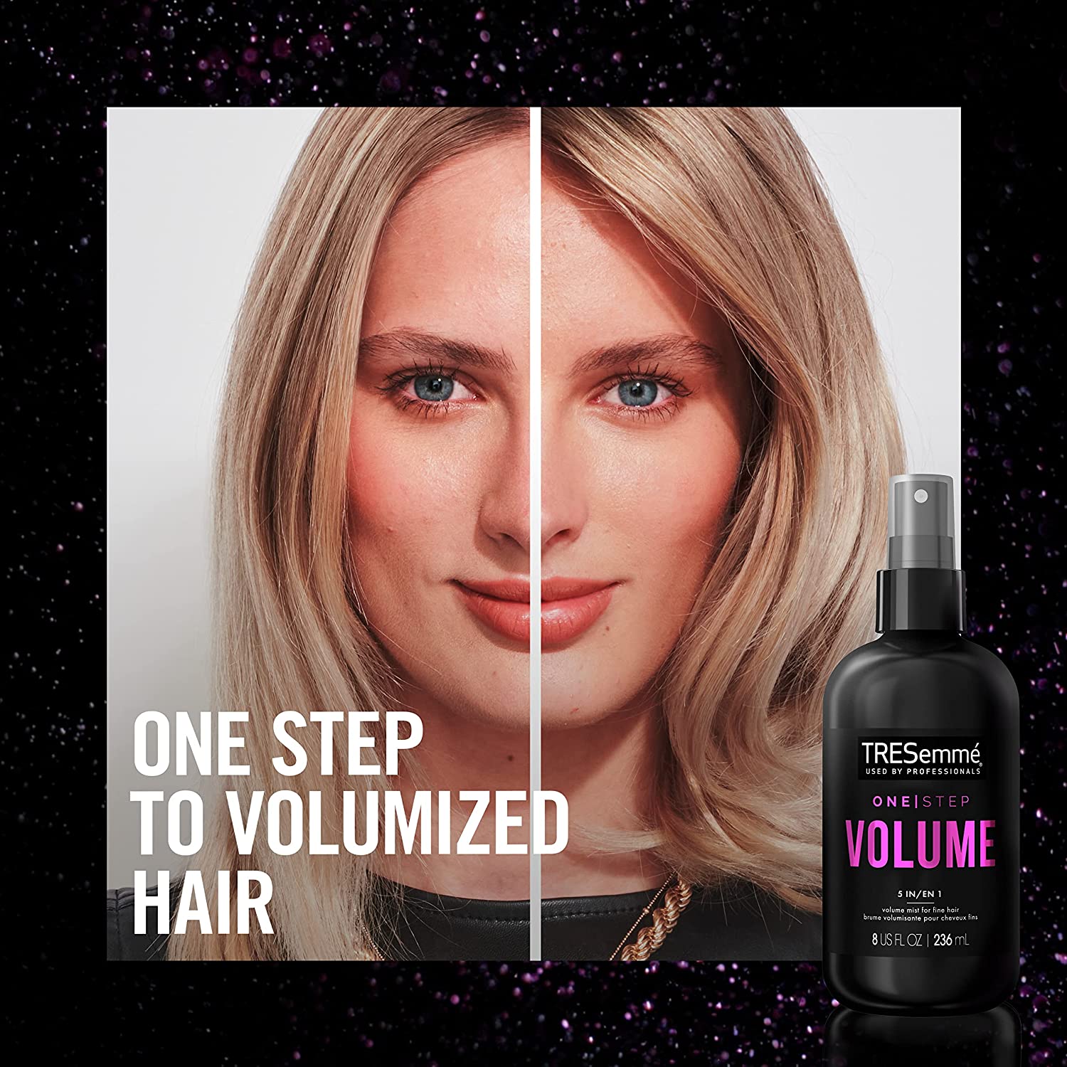 Looking for a professional quality hair styling product that creates volume and simplifies your hair routine? TRESemmé One Step 5-in-1 Volume Mist is a salon-quality hair mist that provides 5 benefits for transforming fine hair in one simple step. This innovative, multitasking hair care product instantly helps add volume, strength, heat protection to styling while also providing anti-static benefits with a light hold at the same time. Designed for fine hair, the hair volumizer will amplify your hair styling routine by delivering style and hair treatment all in one easy to use hair mist. Use this hair mist to create lift at the root without the crunch, delivering soft feel and weightless volume for fine hair. How to use: Simply spritz onto damp hair, focusing at the roots for lift. Blow dry with a round brush for extra volume. We've always understood that style is more than a look: it's a part of you. With our professional quality care, a world of style possibilities is yours to achieve. Every choice we make at TRESemmé, from the values we promote-such as not testing on animals and being PETA-approved-to the stylists we work with, down to the carefully selected ingredients we use, are made with intention and inspired by the latest trends and style. Because 70 years on, we believe in the power of style. So tell your story, land that job, make your mark – and achieve your aspirations with confidence. With TRESemmé, your style can match your ambition.