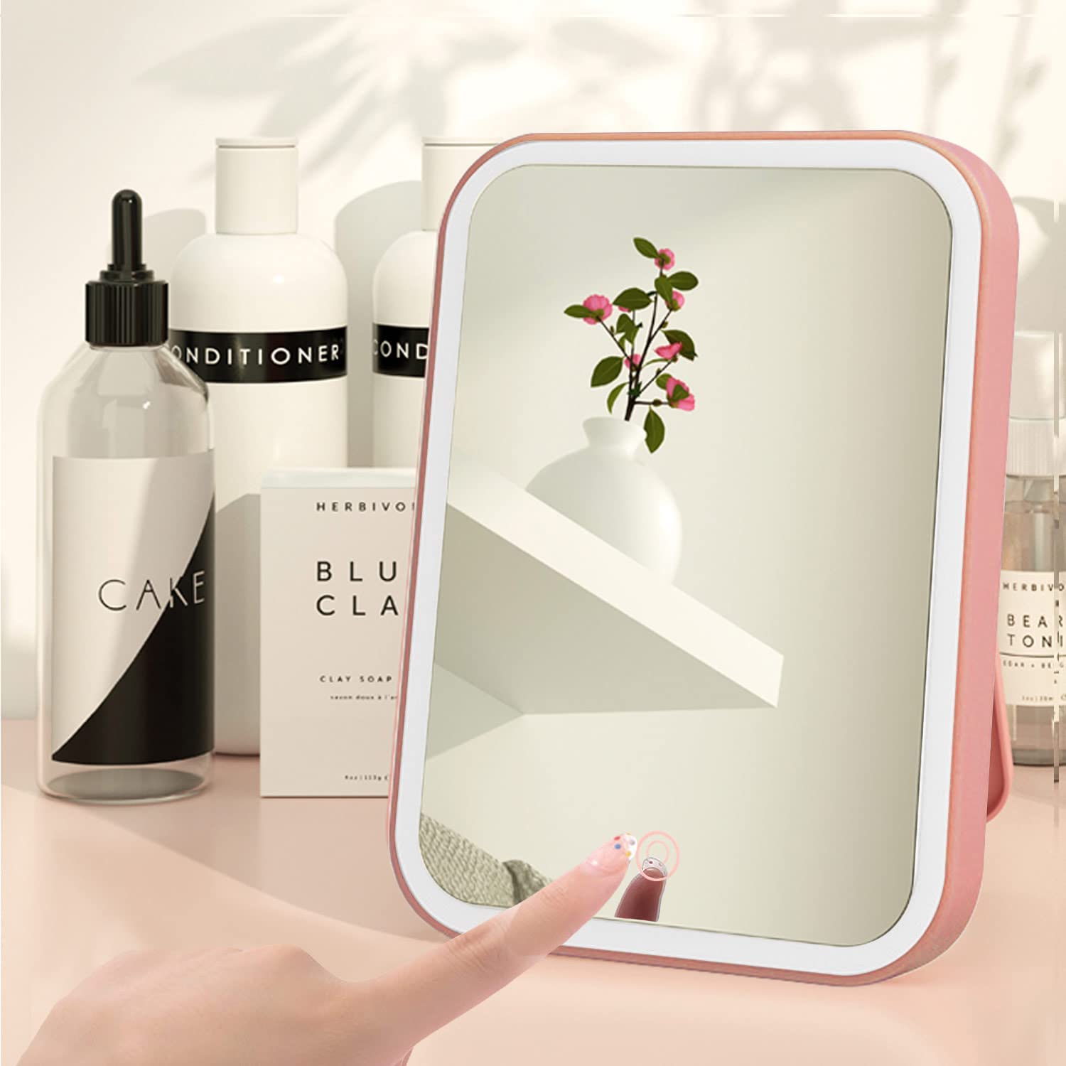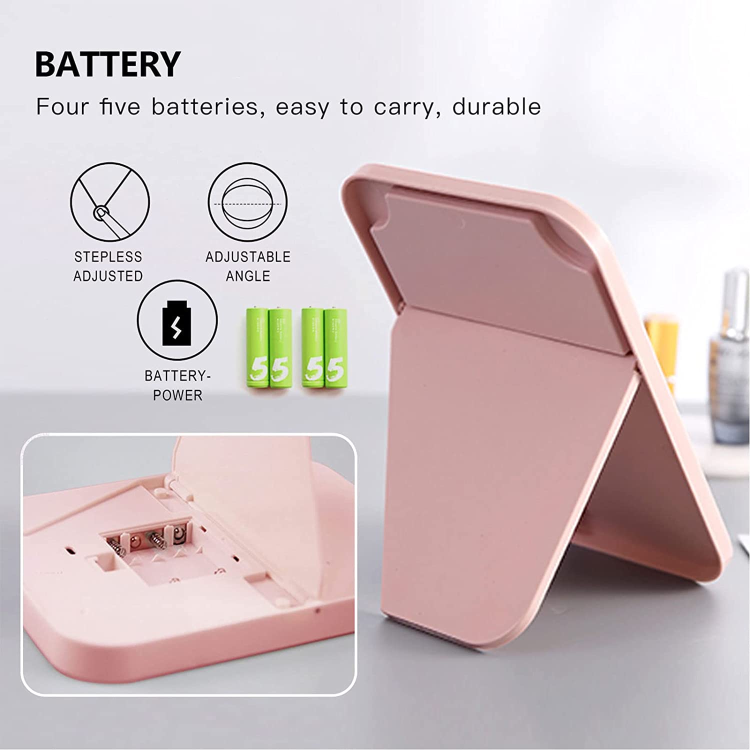 【Design】The LED makeup mirror comes with 33 LED bulbs that can be turned on by touch. It has 3 lighting options that allow you to use in different lighting environments. Installing four lithium 5 batteries will give it longer lighting time and allow you to walk around using makeup mirrors. If you use it in the morning when you first wake up, you can definitely feel the convenience of its light conditioning feature.