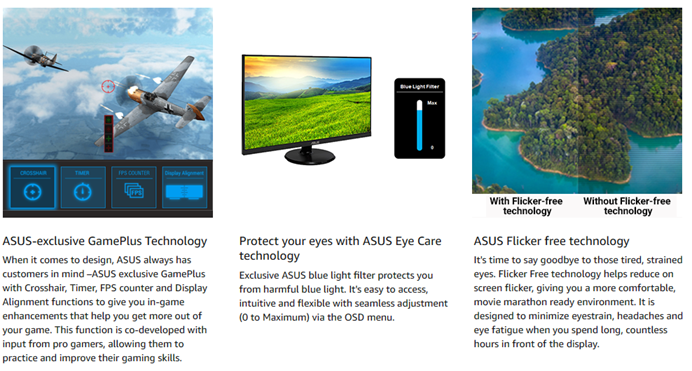 - ASUS Eye Care monitors feature TÜV Rheinland-certified Flicker-free and Low Blue Light technologies to ensure a comfortable viewing experience
