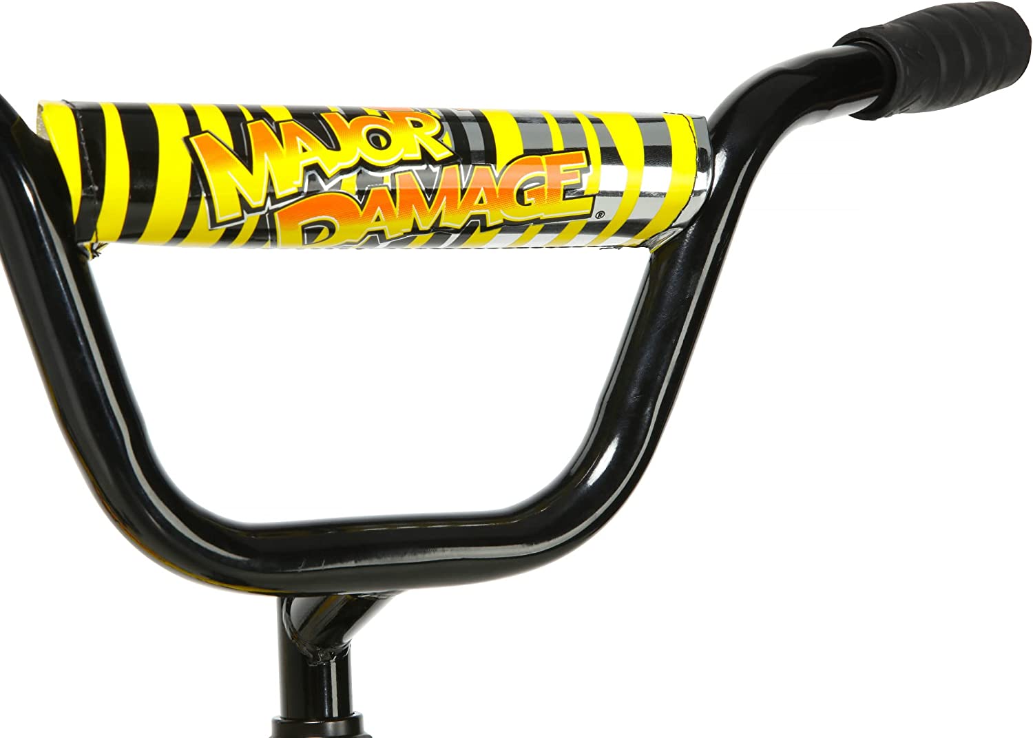 Be awesome, be epic, and cause some major damage! You’re sure to accomplish all three when you ride the Magna Major Damage 12-inch Boys Bike by Dynacraft. This BMX-style frame features a bright blue and black deluxe paint finish, along with eye-catching custom graphics and colorful details on the handlebar pad, frame, and chain guard. Coaster brakes make stopping especially easy and removable/adjustable training wheels provide an extra level of stability until they’re ready to cruise on their own. An adjustable, padded seat also allows the bike to grow with them. The size and design of the bike are great for riders ages 3-5 years. Give your young one an epic ride on the Dynacraft Major Damage 12-inch Boys Bike.