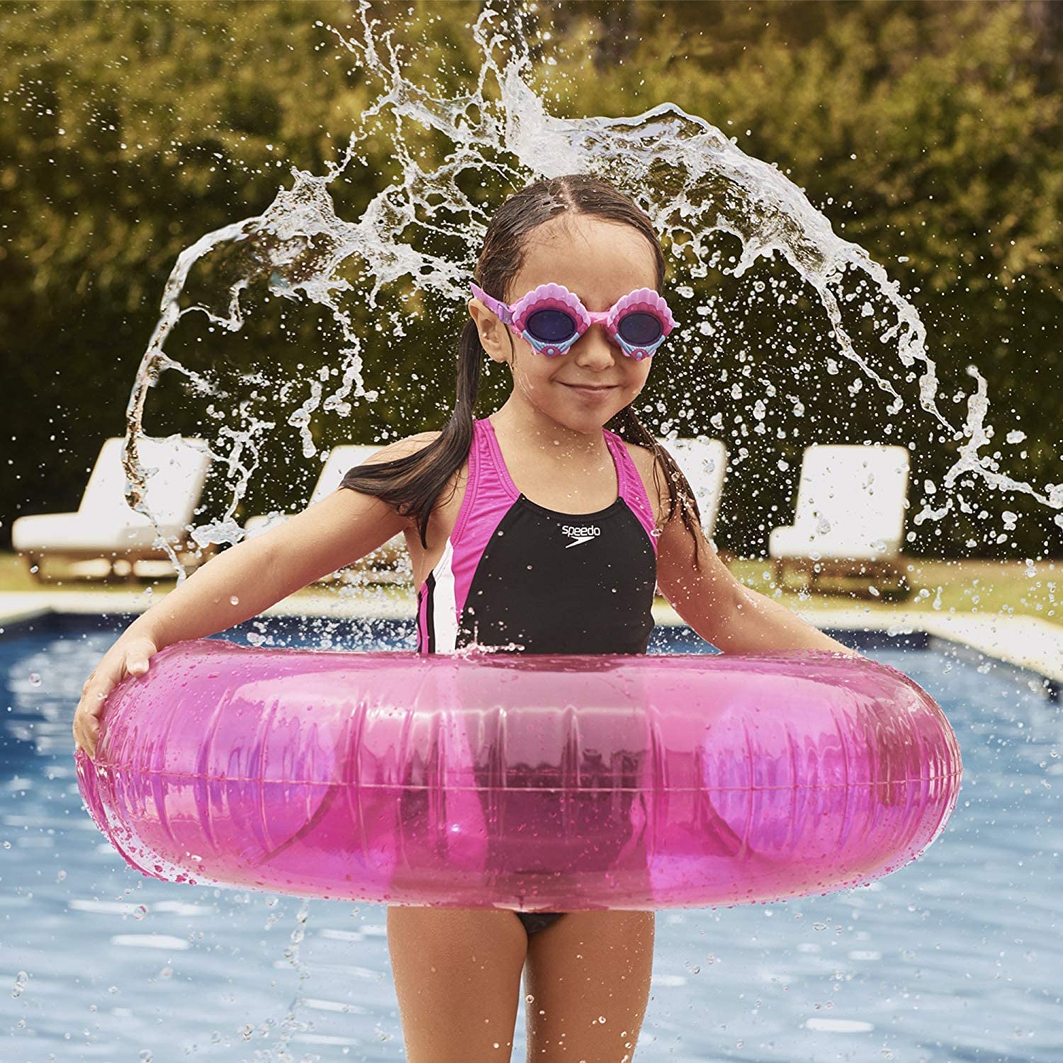 Speedo Boy's Size Charts Speedo Girl's Size Charts Swim laps around the competition in the Infinity Splice One-Piece Swimsuit. Xtra Life Lycra® Fiber: • Lightweight stretch fabric offers a wider range of motion in and out of the water.• Engineered to last over 200 hours in the pool.• Resists sagging, suntan lotion, oils, and chlorine. UV50+ Block the Burn protection from the sun's harmful UVA and UVB rays. Scoop neckline. Racerback design with cutout detail. No-Wedgie Worries offers silicone gripper at back legs for stay-put comfort. Moderate-rear coverage. 82% polyester, 18% spandex;Lining: 100% polyester. Hand wash, line dry. Imported. Measurements: One Piece Length: 19 in Product measurements were taken using size 8 Big Kids. Please note that measurements may vary by size. If you're not fully satisfied with your purchase, you are welcome to return any unworn and unwashed items with tags intact and original packaging included.