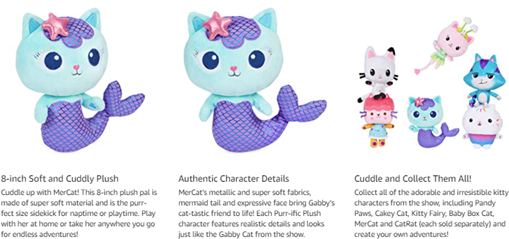 Bring home the irresistible kitty characters from Gabby’s Dollhouse with the Purr-ific Plush! This adorable MerCat plush toy features both metallic mermaid fabric and super soft fabric, and embroidered details, bringing Gabby’s cat-tastic friend to life. At 8-inches tall, MerCat is the perfect size for cuddles or playtime, at home or on-the-go! From Gabby’s best pal Pandy Paws’ signature pointy ears, Cakey Cat’s sweet sprinkle details, Baby Box Cat’s polka dot dress and more, each Purr-ific Plush stuffed animal (each sold separately) looks just like the character from the NETFLIX original series. Kids can collect all of the cuddly soft toys from the show and use their imagination to create their own adventures with their new plush pals. Snuggle up with the Gabby’s Dollhouse MerCat Purr-ific Plush!
