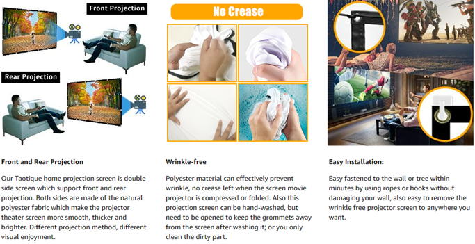 - Wide Application - The indoor projector screen with good pictures quality and lightweight design is not only suitable for indoor, such as home theater, education, presentation, lectures, offices, classroom or gaming etc, but also for outdoor use. What’s more, our home projector screen also can be used as a gift to your family, friends, lovers, as enhance relationship by sharing viewing experiences or talking about the plot in the movie night or some important occasion(Thanksgiving, Christmas).