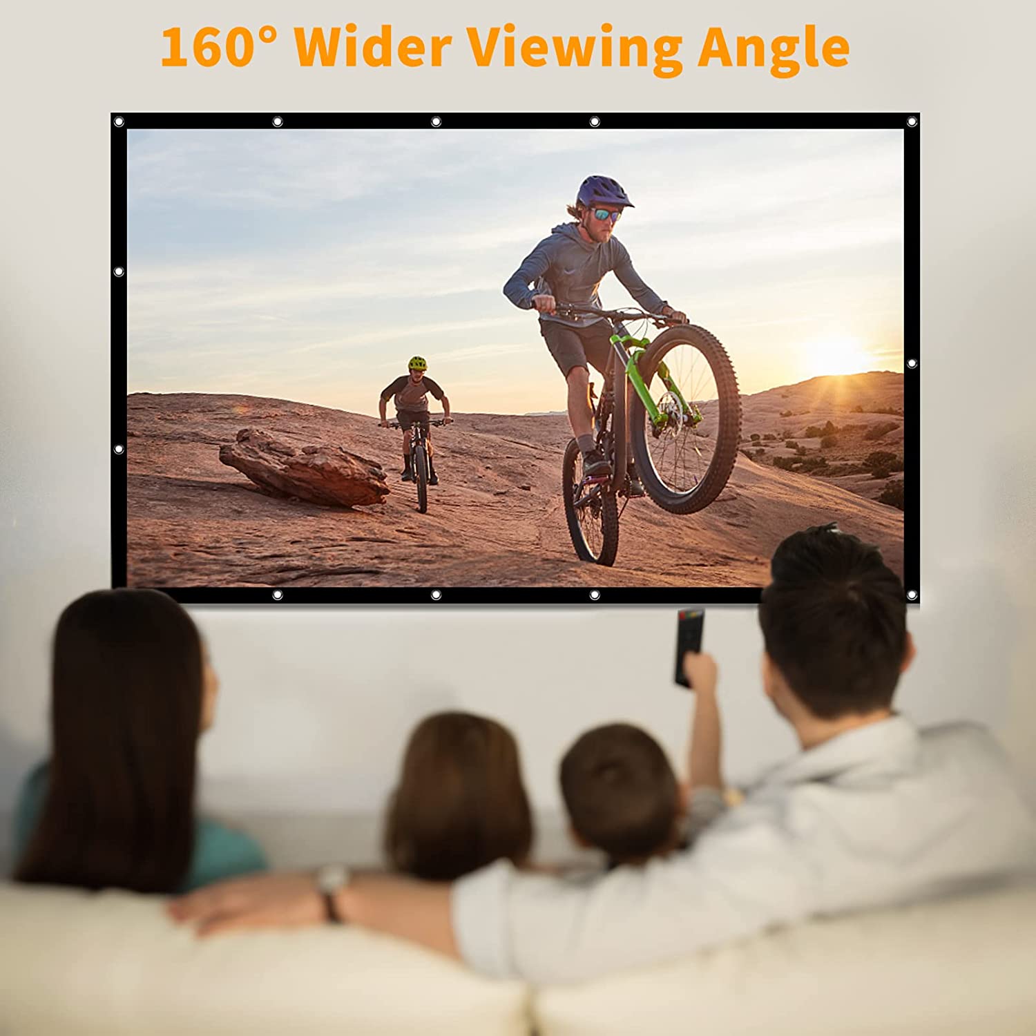 - 160° Wider Viewing Angle - The outside projector screen with a wide viewing angle up to 160° and 120 inch big size, that means you don’t need to sit directly in front of the screen, just only need to select the most comfortable viewing posture to enjoy wonderful movie night. Even if you want to invite your neighbors or friends to watch the movie together, it will not look crowded, because our portable projector screen supports double-sided projection, no need to worry about crowds anymore.