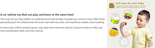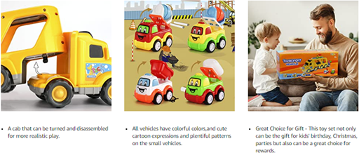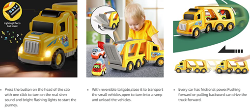 TEMI highly recommend this 5-in-1 Truck Toy Set for children's birthday / party / Christmas gifts, which allows your child to receive a big carrier truck and 4 of small public bus / taxi car / airplane at the same time. The colorful colors and cute cartoon expressions and patterns on the small vehicles will attract children very much and let them put it down.