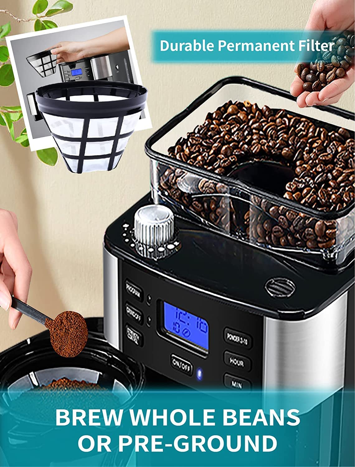 - ☕【AUTOMATIC START FUNCTION】: Entering the timer mode and setting the time you wanted to automatic start, the programmable timer will preset the machine start time and start brewing coffee at the specified time. There is a prompt bell after brewing. It helps to save time making coffee in the morning. After brewing, there is a warming plate design that the coffee can be warmed in the carafe lasts for 120 minutes.