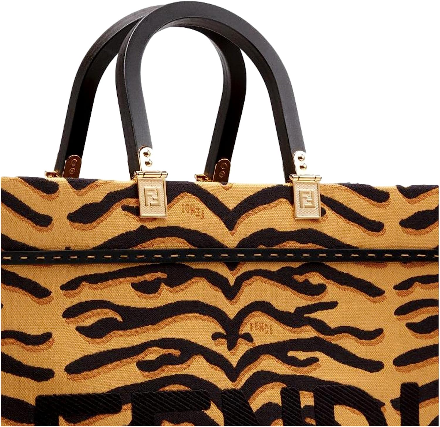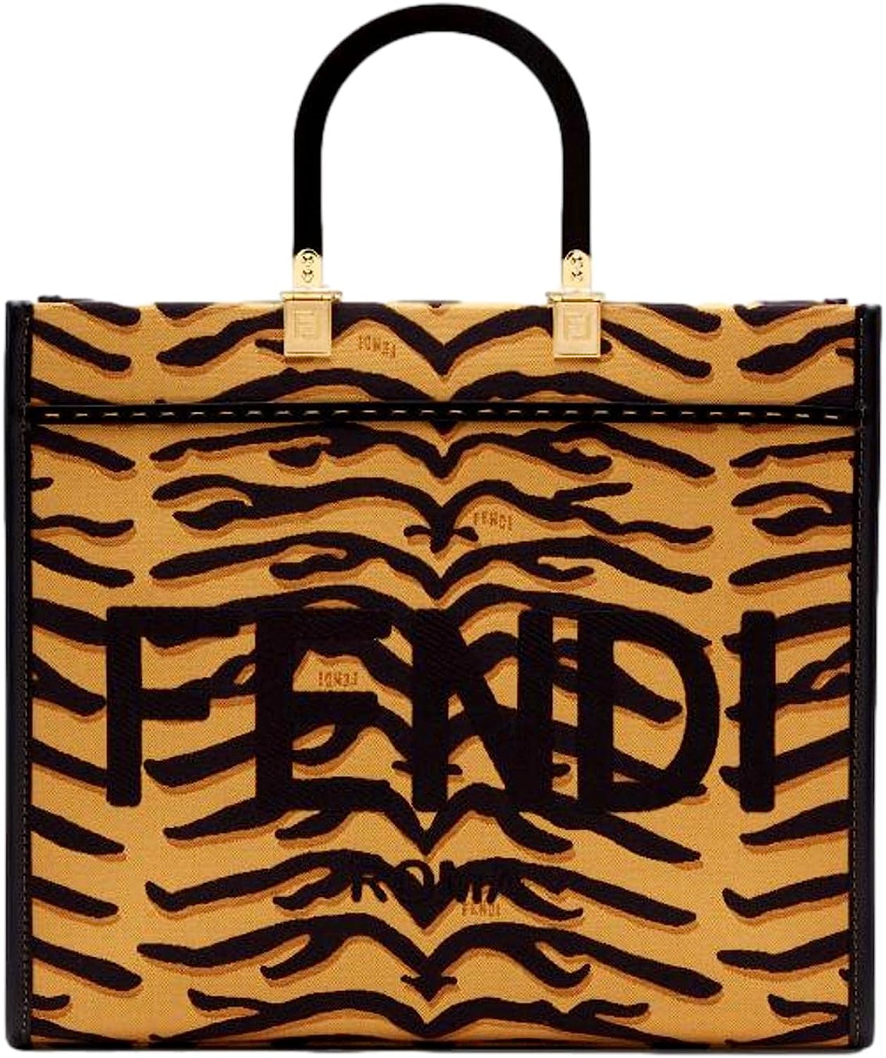 • This Fendi Sunshine Shopper Bag combines classic lines with a bold tiger print in the canvas shopper tote. The designer was inspired by the Chinese Year of the Tiger celebrations and the bold black and yellow colors make the print pop.