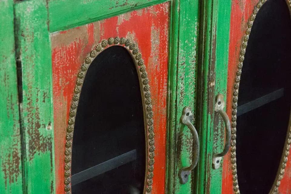 Antique Indian Brass Work Hand Carved Solid Wooden Sideboard Greenwash Mango Wood Indian Arched Sideboard Cabinet Storage Units Indian Solid Wood Finish,Living Room Bedroom Furniture,Modern Sideboard
